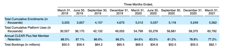 Let’s dig into the numbers. Compared to March 2019, enrollments, uses and total bookings in the quarter ending March 31, 2021 were up meaningfully. If you question why retention rate has been trending down and why the explosive growth often seen in IPOs is absent here, it’s worth noting that Covid-19 severely limited in-person events as well the travel industry; therefore, it is not surprising to see such a great adverse impact on CLEAR’s business. With that being said, as the country is opening up, travel is getting back to 2019 level and in-person events are relatively safe again, do expect to see these numbers go up in the next few quarters.