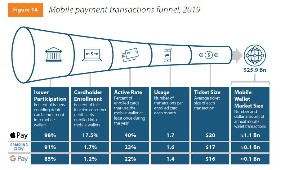Apple Pay is a proprietary mobile wallet by Apple that enables convenient payments by just a phone tap in stores or one click online. The feature is compatible on iPhone 6, all the models that came after and all Apple Watch. That should cover pretty much every iPhone user in the U.S, which makes up 60% of the mobile market domestically. Since its debut in 2014, Apple Pay has grown increasingly popular over the years. As of January 2021, Apple Pay is available in 90% of stores in the U.S and hundreds of websites, including those of major brands. According to the 2020 Debit Issuer report by Pulse, mobile wallet debit payments in the U.S in 2019 by Apple Pay, Samsung Pay and Google Pay totaled $1.3 billion, of which $1.1 billion came from Apple Pay. As of this writing, major cities such as Chicago, Los Angeles, New York City, Portland, San Francisco & Washington D.C already allow passengers to ride transit with Apple Pay. This kind of integration will only boost its popularity more in the future.