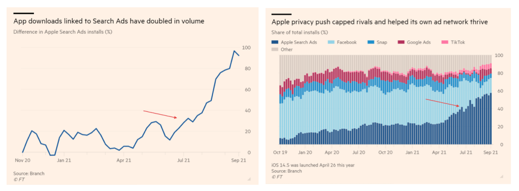 Last month, FT put out an article named “Apple’s privacy changes create windfall for its own advertising business“, which alleged that Apple successfully tripled their ads business significantly with the introduction of their own ads platform and self-serving security policies. To back up their thesis, FT used data from Branch, a mobile marketing consultancy firm. While it all sounds logical, there are a lot of holes in their argument. First, while FT referenced Branch and their work, there is no link to the source study or research. I actually went to Branch’s website, but couldn’t find anything that remotely looked like what FT might have used. If the entire article is based on data from one source, it’s very important to understand what raw data goes into the source. We have none of that here.