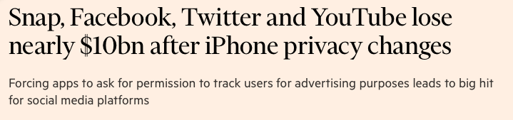 I was shocked when I saw these two charts. First of all, none of the companies Facebook, YouTube, Snap or Twitter confirmed the exact impact on revenue by iOS privacy changes. 13.2% impact isn’t modest. It’s material enough and in the case of Facebook, it is a huge revenue loss. Hence, Because Facebook’s management itself didn’t disclose any concrete figures, how do we know that Lotame or FT’s assumption is correct? Secondly, FT had no problem adding the word “Expected” to their revenue projection of these firms. That’s fair and good. That begs the question: Q4 doesn’t conclude yet, then how can they say with such conviction that iOS privacy changes cost these firms $10 billion? Said another way, I’d be happier if FT either added the word “expected” to the headline (Snap, Facebook, Twitter and YouTube ARE EXPECTED to lose nearly $10bn after iPhone privacy changes) or only used Q3 data in their assumption. In that case, it wouldn’t be $10 billion any more and would likely attract far fewer readers.