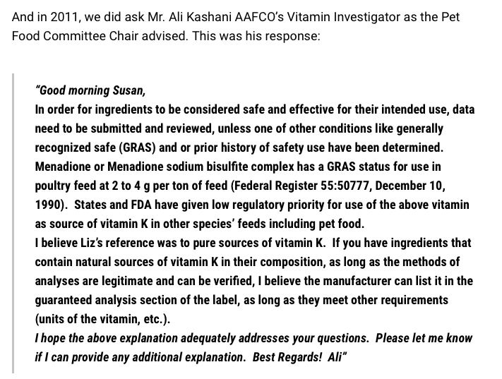 Nowhere in Dr Kashani’s response did he mention that Menadione is approved for use in pet food. He clearly relies on the FDA guidelines, which, as mentioned above, only regulate the use of natural Vitamin K sources K1 and K2. Like the FDA, AAFCO only approves Vitamin K3 for poultry feed, not for pet diets. Sadly, pet food manufacturers muddy the waters and use it as a blanket excuse for their inclusion of this supplement in commercial pet products. In a response to a customer’s question, the owner of Weruva said: “according to AAFCO, cat food that contains at least 25% seafood on a dry matter basis must contain a certain level of vitamin K, and according to AAFCO, the only approved source of vitamin k is menadione“. As you can see from the screenshot below, it’s not exactly what is in the rule book.