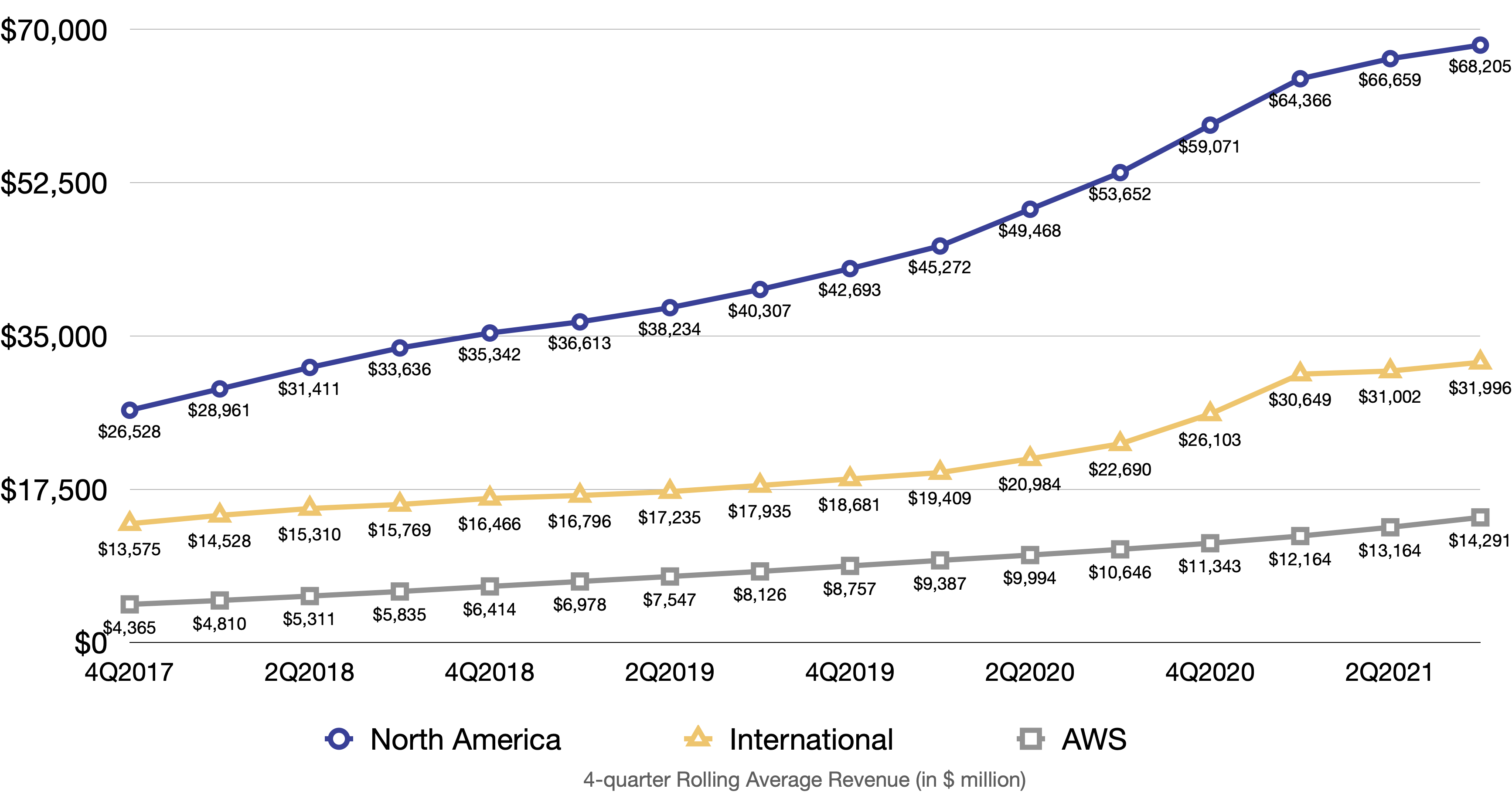 Amazon’s revenue growth slowed down significantly in the last 6 months after being pulled forward by Covid-19; which may explain the timid growth of their stock price