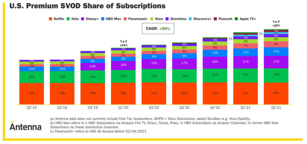 The last issue I have with Antenna is the inconsistency of the reported data. In Q2 2021, Antenna claimed that Netflix has a market share of 29% (Figure 4). However, in their latest report for Q3 2021, Netflix’s share declined to 30% from 32% in Q2 2021 (Figure 5) . The two reports seemingly have the same methodology and feature the same number of streamers as well as the composition. My question is: what changed? How did Netflix’s Q2 2021 share go to 29% in one report to 32% in another?