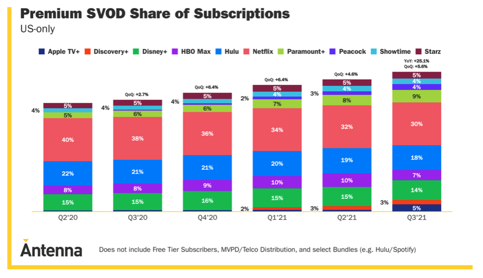 The last issue I have with Antenna is the inconsistency of the reported data. In Q2 2021, Antenna claimed that Netflix has a market share of 29% (Figure 4). However, in their latest report for Q3 2021, Netflix’s share declined to 30% from 32% in Q2 2021 (Figure 5) . The two reports seemingly have the same methodology and feature the same number of streamers as well as the composition. My question is: what changed? How did Netflix’s Q2 2021 share go to 29% in one report to 32% in another?