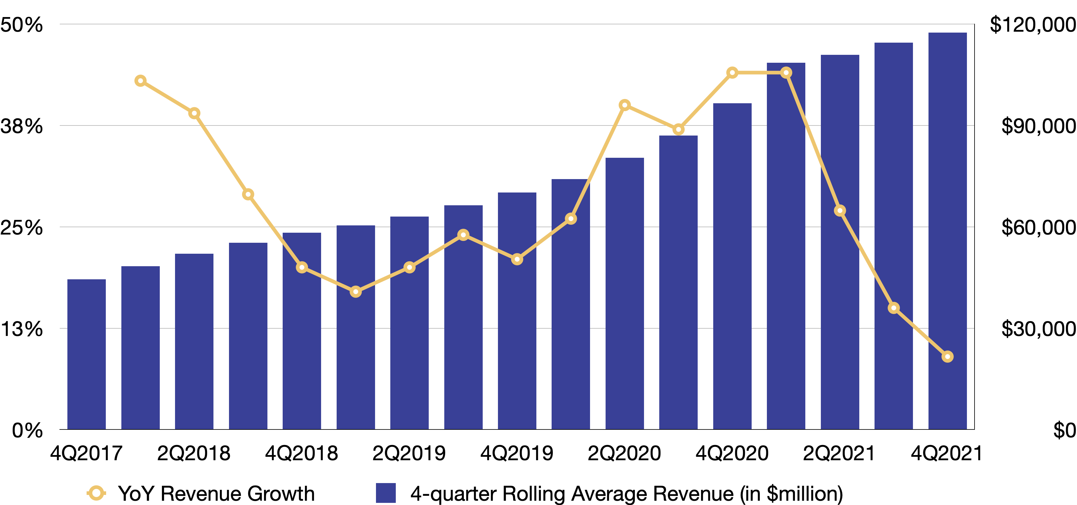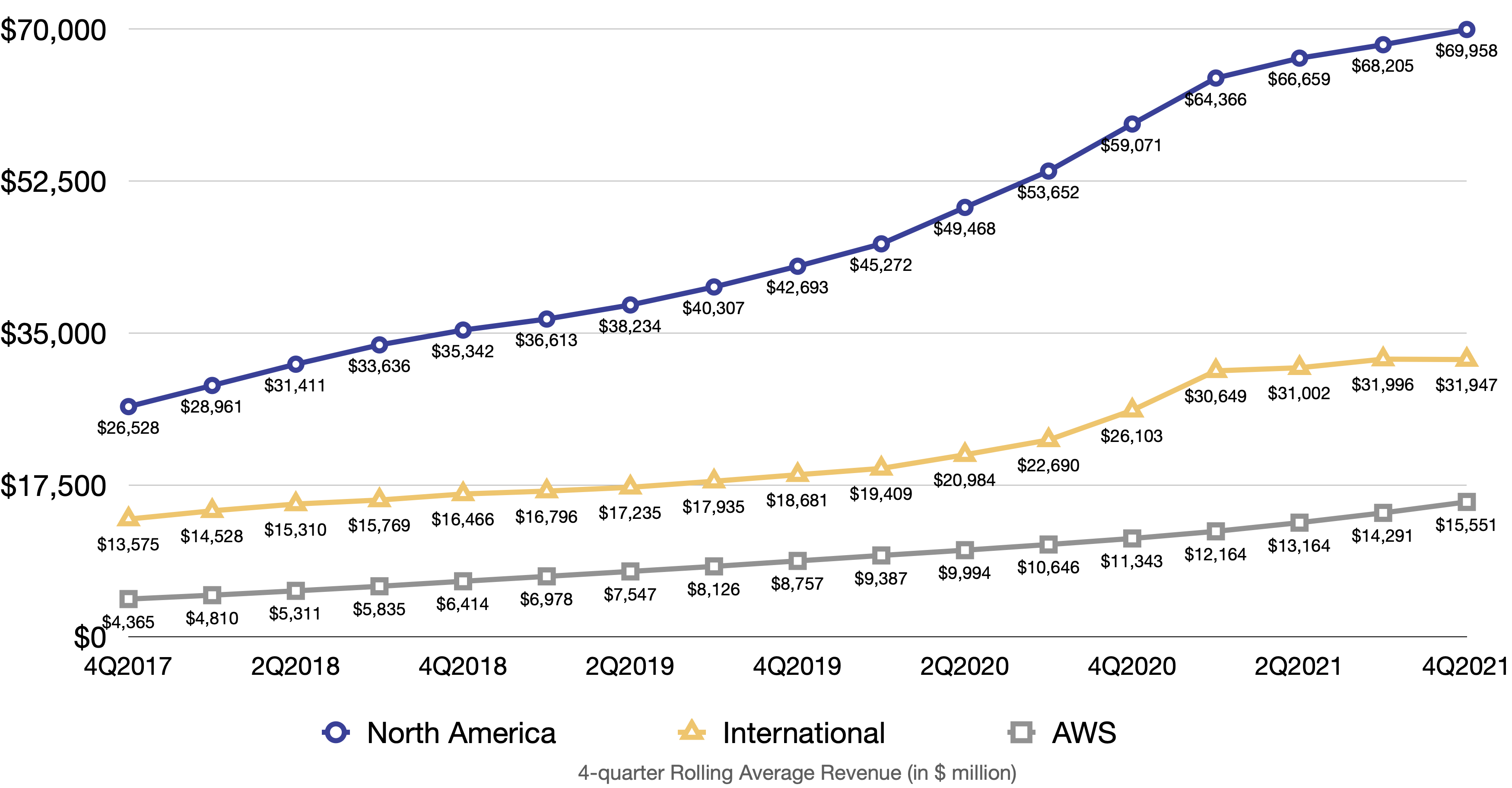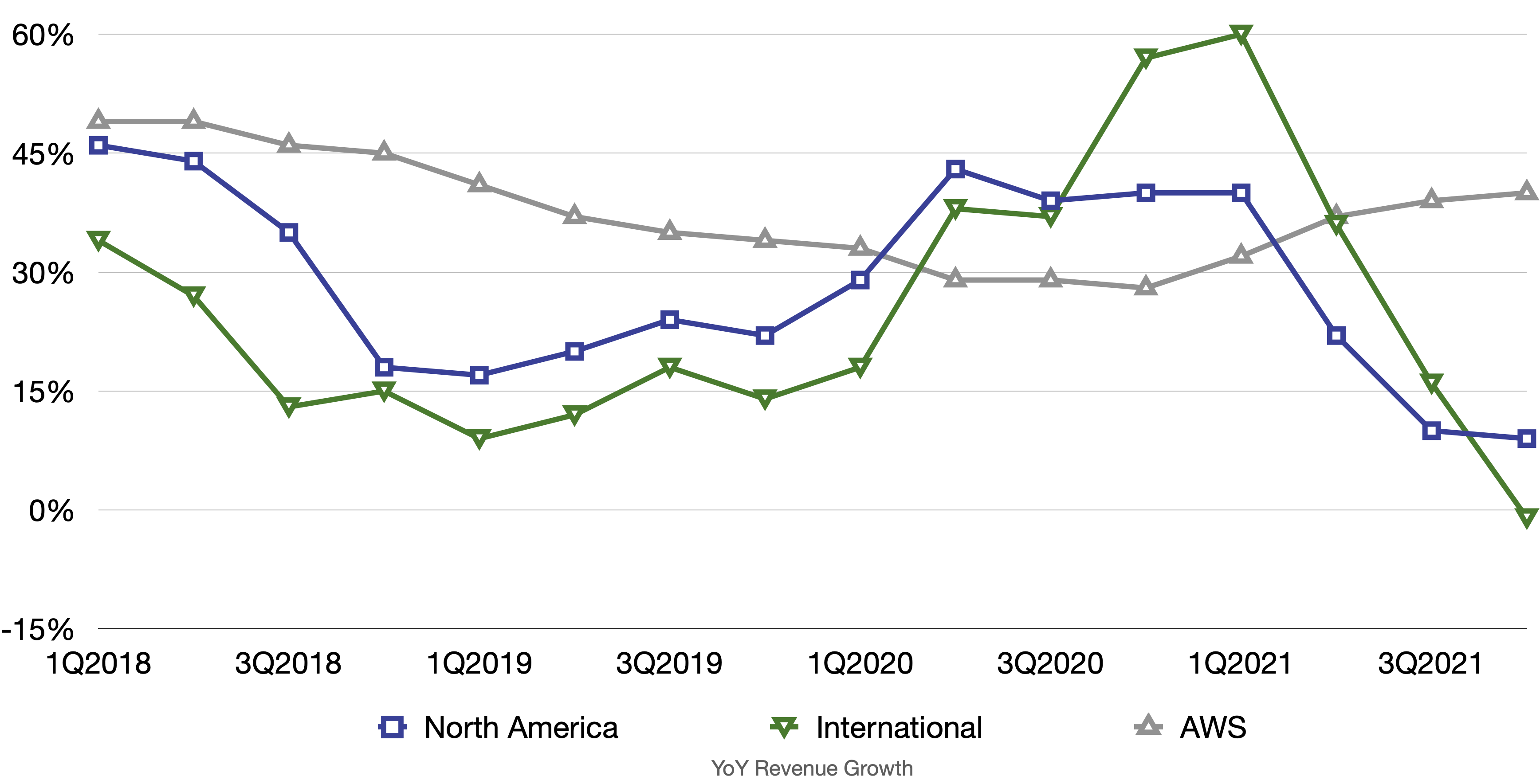 North America and International have seen decreasing growth for the last three quarters. International even contracted in Q4 FY2021. AWS is impressive