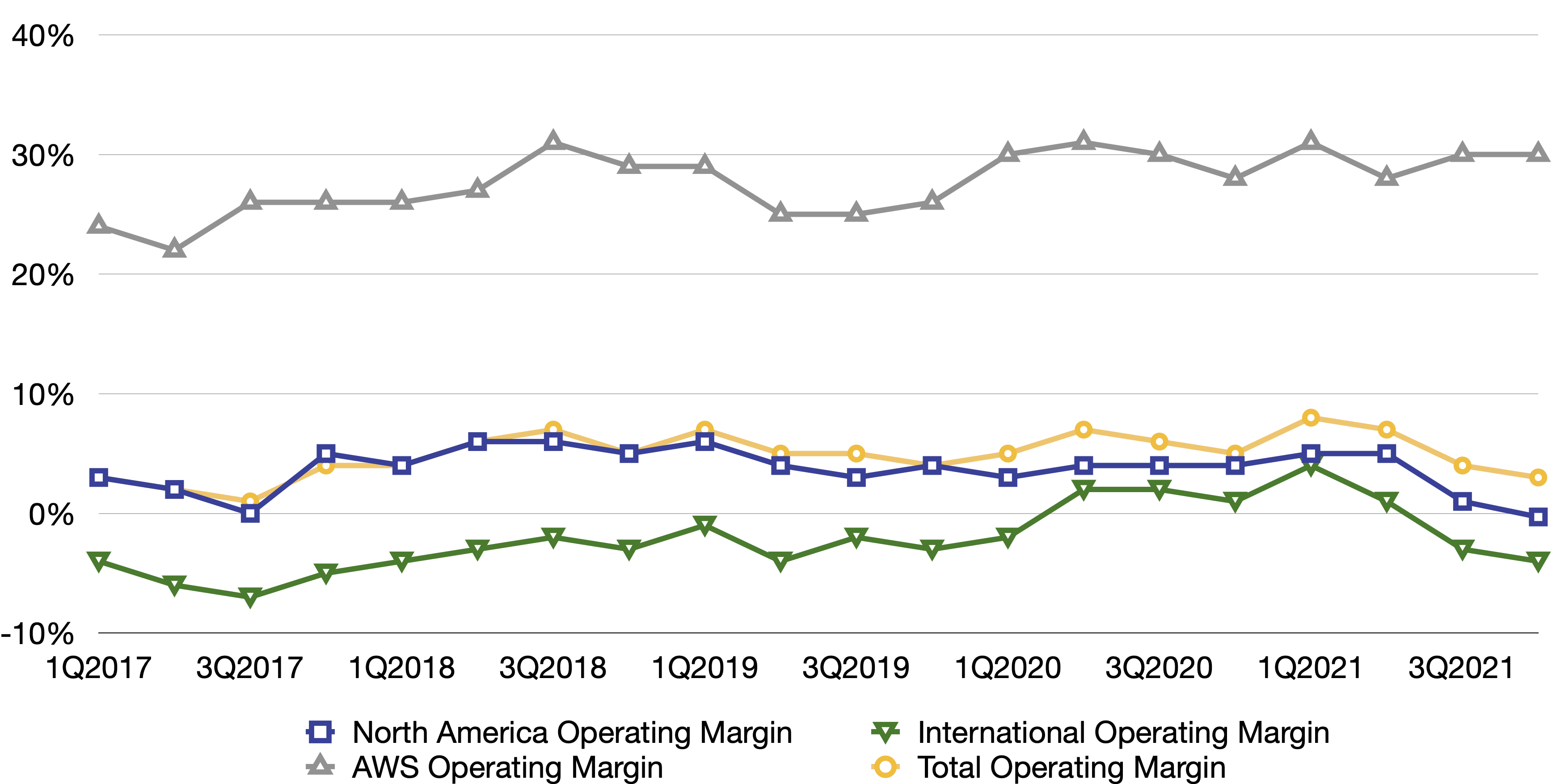 Both North America and International were in the red in Q4 FY2021. AWS is the sole reason why Amazon has a positive operating margin