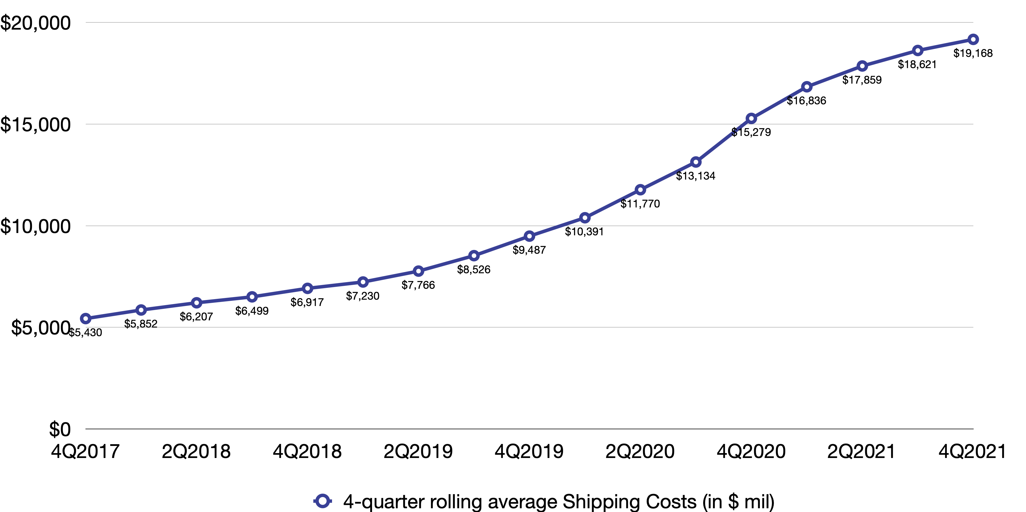 Amazon spent $72 billion in shipping costs in 2021. It crossed $20 billion a quarter mark in Q4 2021