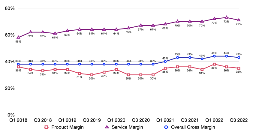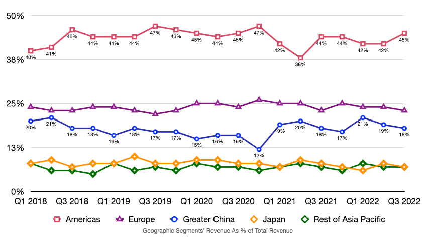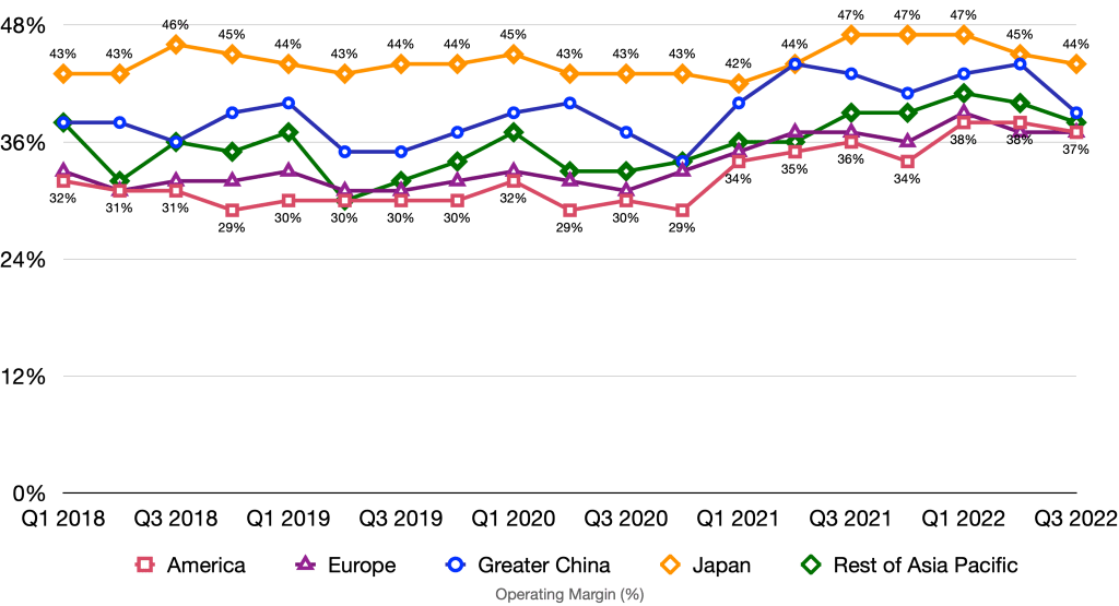 China still made up 18% of the total company, pretty much in line with the historical figures for Q3. According to Apple, China’s Services revenue grew faster than the company average of 24% and hit an all-time June quarter record. The growth in Services revenue was offset by the lower demand of products in China, due to the lockdown, albeit a push late in June. China’s operating margin dropped from 43% to 38%. Because Services, which has a higher margin, grew this quarter, the drop in operating margin is likely attributed to higher SG&A. Traditionally, Q4 is the weakest quarter for China, both in revenue and operating margin. I expect the revenue share and operating margin to drop to 17% and 34% respectively. It’d be great to have an analyst ask the management for more color on China in Q4.