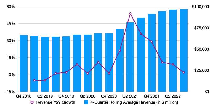 Where are the critics of Apple’s growing Services? The pivot to Services a few years ago raised eyebrows, but eventually proved extremely fruitful and important to Apple. Not only does Services make customer experience on Apple’s devices better, but it also aids the company’s profitability with 70% gross margin. Since 2019, Services is the only part of the business that has had no down quarter and as of this quarter, made up 24% of the company’s top line. For reference, in terms of 4-quarter rolling average revenue, Apple’s Services is already bigger than Amazon’s AWS.