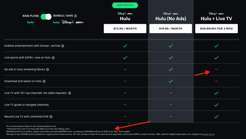 Can an unsuspecting casual viewer know easily that this plan has ads on Hulu and prices will increase to $75/month soon?