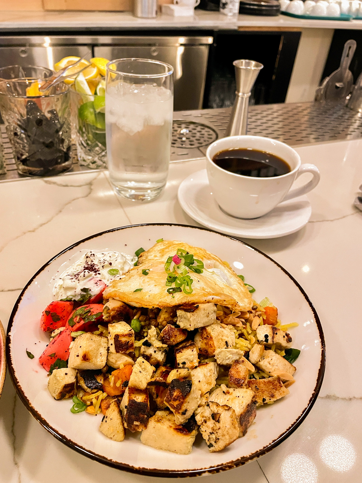 One of a few great places that open by 10AM, as far as I know. We went there 15′ after it opened and the place was already crowded. Without a reservation, guests will be seated at the bar on a first-come-first-serve basis. My wife had the Dirty Caesar Salad and I had the Lebanese Fried Rice. Both were excellent and didn’t take long to make.