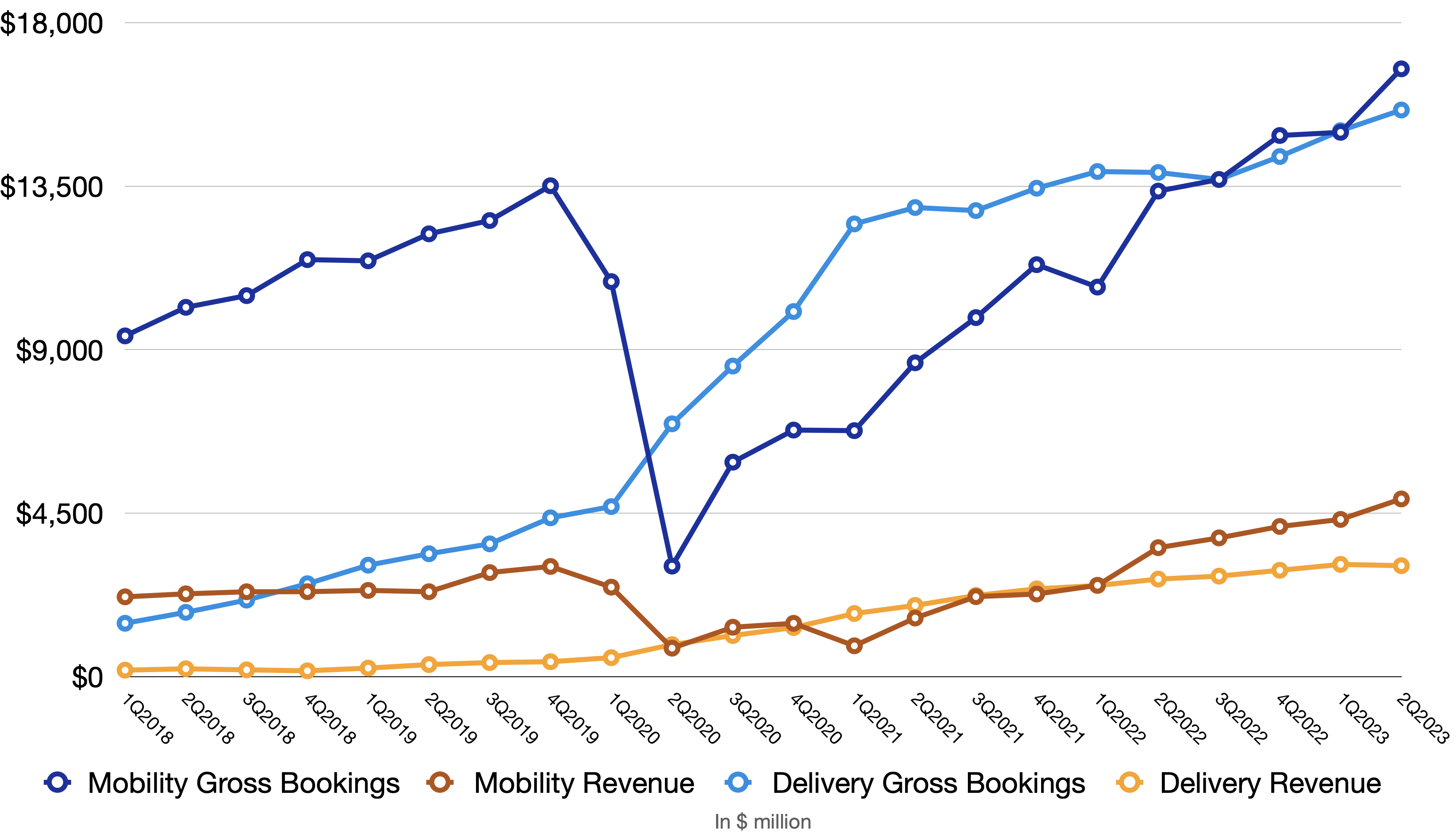 This chart illustrates how the two biggest segments of Uber have evolved in the last few years. At first, Mobility was the dominant force while Delivery was still growing at a smaller scale. Then, the pandemic came. Stay-at-home order and the risk of infection decimated Mobility but turbocharged the growth of Delivery. Three years later, Mobility is once again the biggest contributor, but Uber now has two businesses of equals. Without Covid, I don’t know if we would have had the Uber of today.