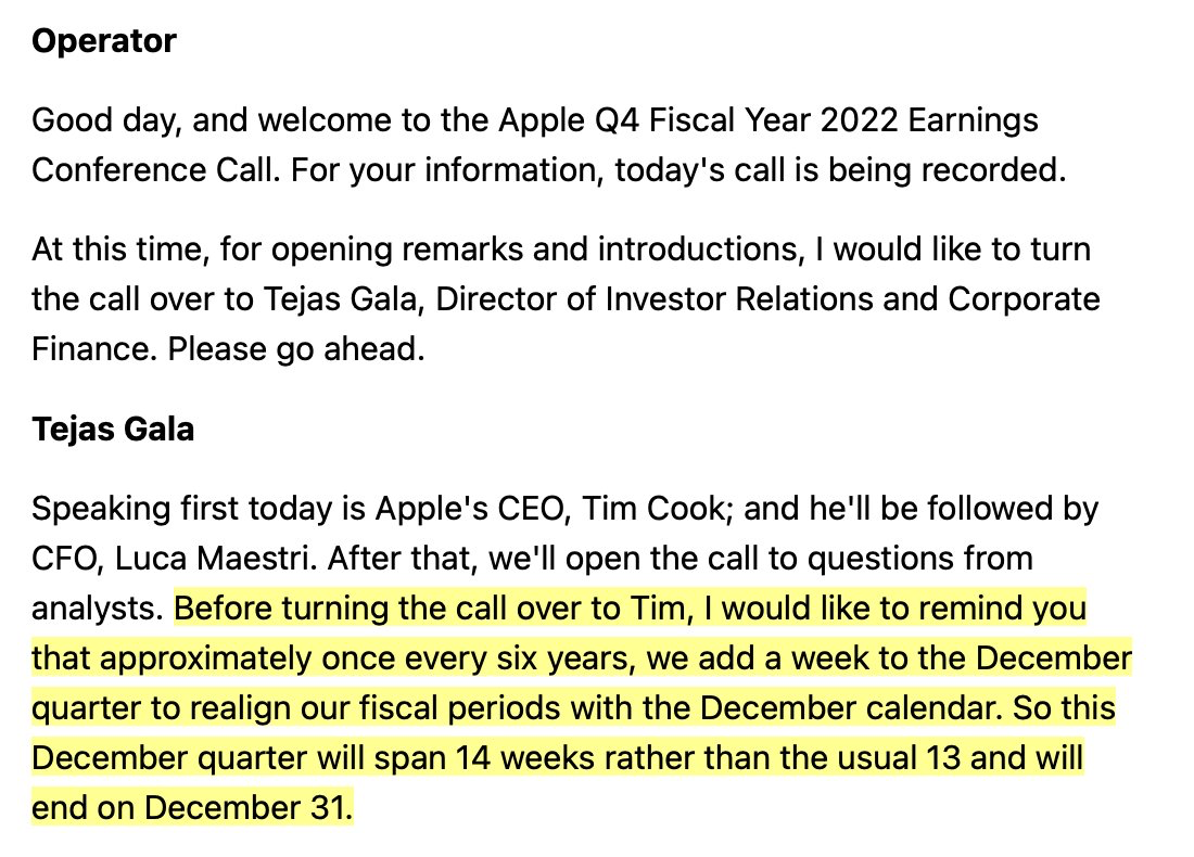 YoY comparison is a useful method to evaluate how the business does compared to the same time 12 months ago. For a business like Apple, it removes the seasonality effect like you see below. With that being said, there are still nuances that come with YoY compare, especially when a company has some unusual reporting practices like Apple. First, it is important to know that once every 6 years, Apple adds an extra week to its December quarter (Q1 of a fiscal year). They did it for FY2023 and FY2017 before that. As a result, Q1 FY2023 had an advantage of an extra week while Q1 FY2024 will be disadvantaged by the same factor. To quantify the impact of this extra week, Apple CFO said it was worth 7% of Q1 FY2023 revenue.