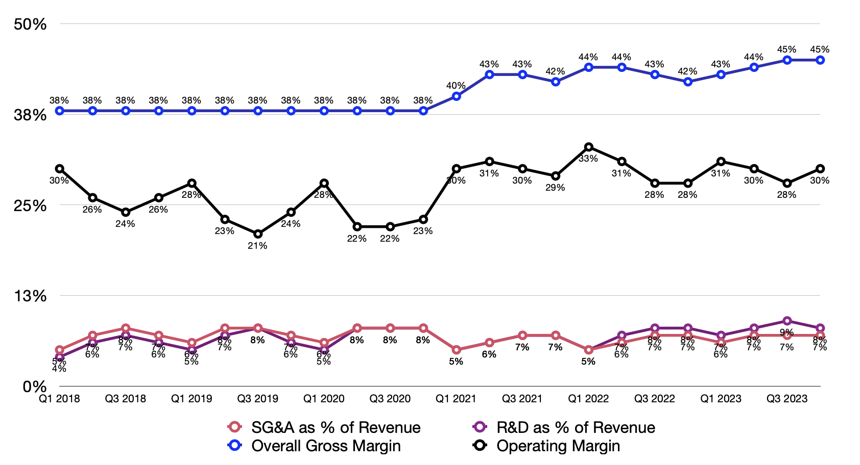 - The company is launching Vision Pro next year. There is little information on its margin profile, but at $3,000+ per item, I assume it will be accretive to the company’s margin. Plus, Apple made it clear that its stores would be critical in letting customers test out the product and selling it. This direct channel will give Apple a higher margin than working with a carrier or a channel like Costco or Amazon.