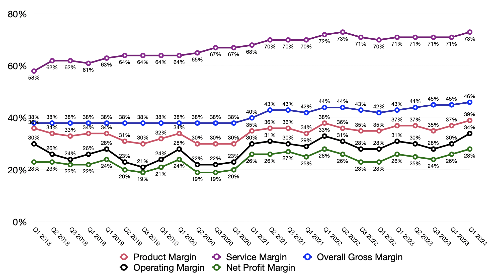 As Apple is unlikely going to have a double digit growth in revenue in the near future, margin improvement is the key lever to grow earnings. With the launch of VisionPro and sustainable strength in higher models of iPhone, I expect Product margin to continue to expand. Regarding Services, it’s a bit more unpredictable. I am not worried about Apple users not paying for services. The challenge is in the regulatory affront awaiting the company. Right now, the biggest change is limited to Europe, which only makes up 7% of the total App Store revenue, but there is no telling what will unfold in the US.