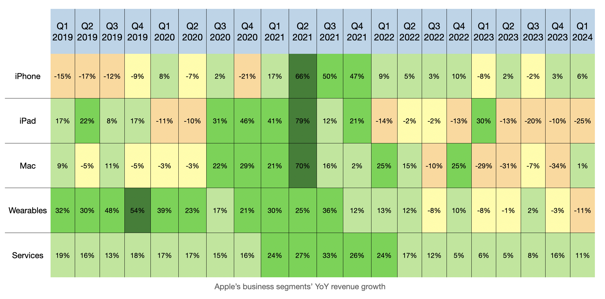 I find it hard to conduct revenue YoY comparisons for Apple, for several reasons. First, because it is a global operation and has many elements, the impact of foreign exchange is significant. Second, unexpected force majeur also affects how Apple runs the business. Covid, the shutdown in China, the incident at a major factory, global supply chain and the shortage of chips delayed the shipment of products and the recognition of income. In addition, Apple doesn’t have a fixed schedule of product rollout. New products provide a jolt of revenue. Because a product line, with the exception of iPhone, seldom has a new release in the same quarter two years in a row, any YoY comparison must account for this factor and hence can be very tricky. Last but not least, every 6 years, Apple adds a week to the December quarter.