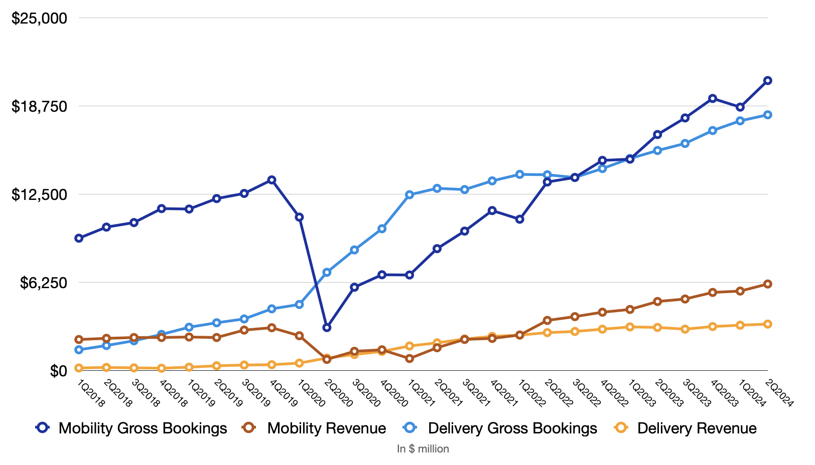 For the last 12 months, Uber delivered $150 billion and $40 billion in gross bookings and revenue, respectively. For comparison, DoorDash and Instacart generated approximate $73 billion and $32 billion in gross bookings respectively. In terms of revenue, it was about $10 billion from DoorDash and $3.2 billion from Instacart. That goes to show the size of Uber and how impressive it is that the company is still growing some of the key metrics by 20% or higher.
