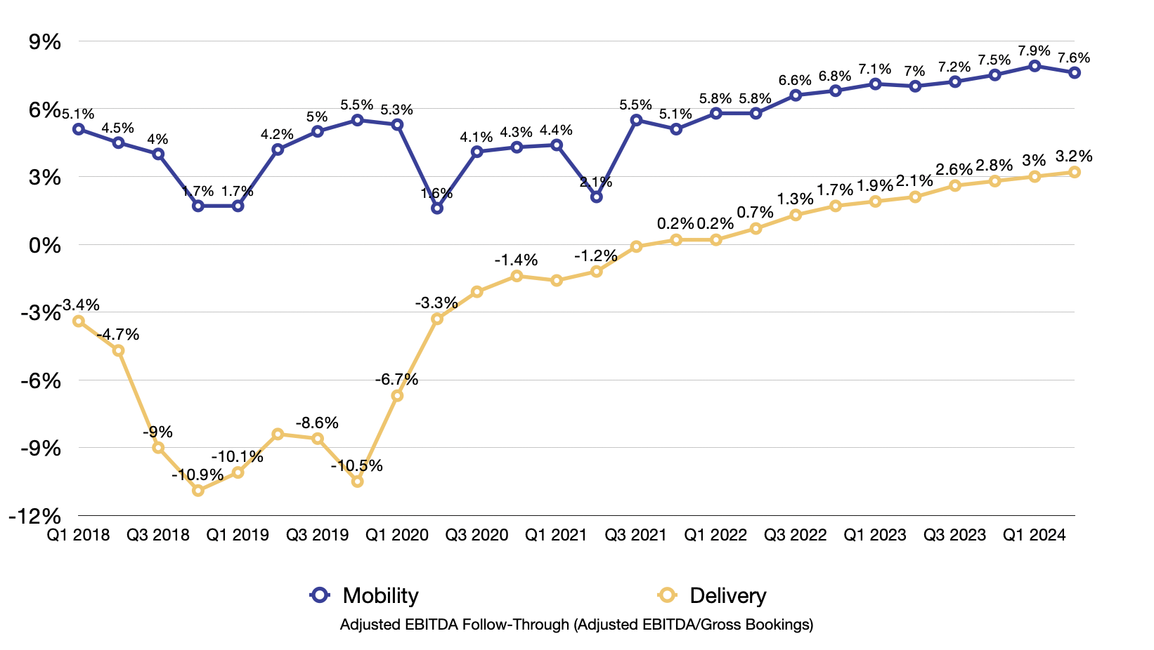 And it’s not only about growth. It’s increasingly profitable growth. Uber Adjusted EBITDA over Gross Bookings has been consistently growing for both Mobility and Delivery. The improved economics stemmed from multiple fronts: