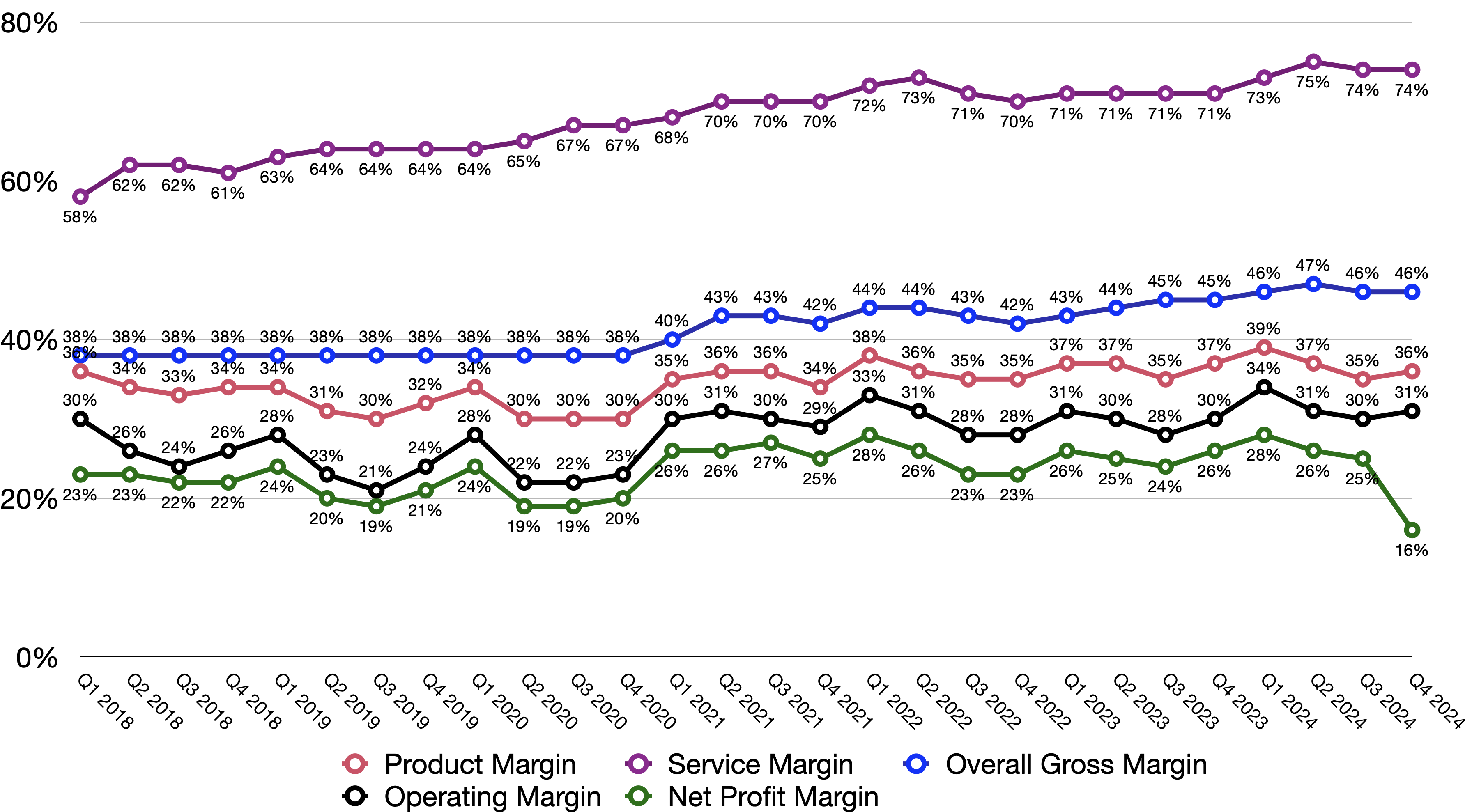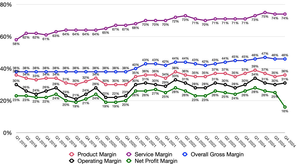 While other tech companies hired and fired people en masse during and post Covid, Apple did not. While others reported massive capital expenditure on AI infrastructure, Apple has been deliberate with its investments and how it integrates a hyped tech into its products. And look at the margins. They are slowly and steadily creeping up. The drop in Net Margin this quarter was due to a one-time charge of $10.2 billion in tax payments to the EU. Without the charge, it would be 26%. Plus, Apple Watch & Airpods are very popular around the world. You see them everywhere. The M-chip Macbooks have been an outstanding success. I ask you: if that’s not convincing you to trust in Tim Cook, what will?