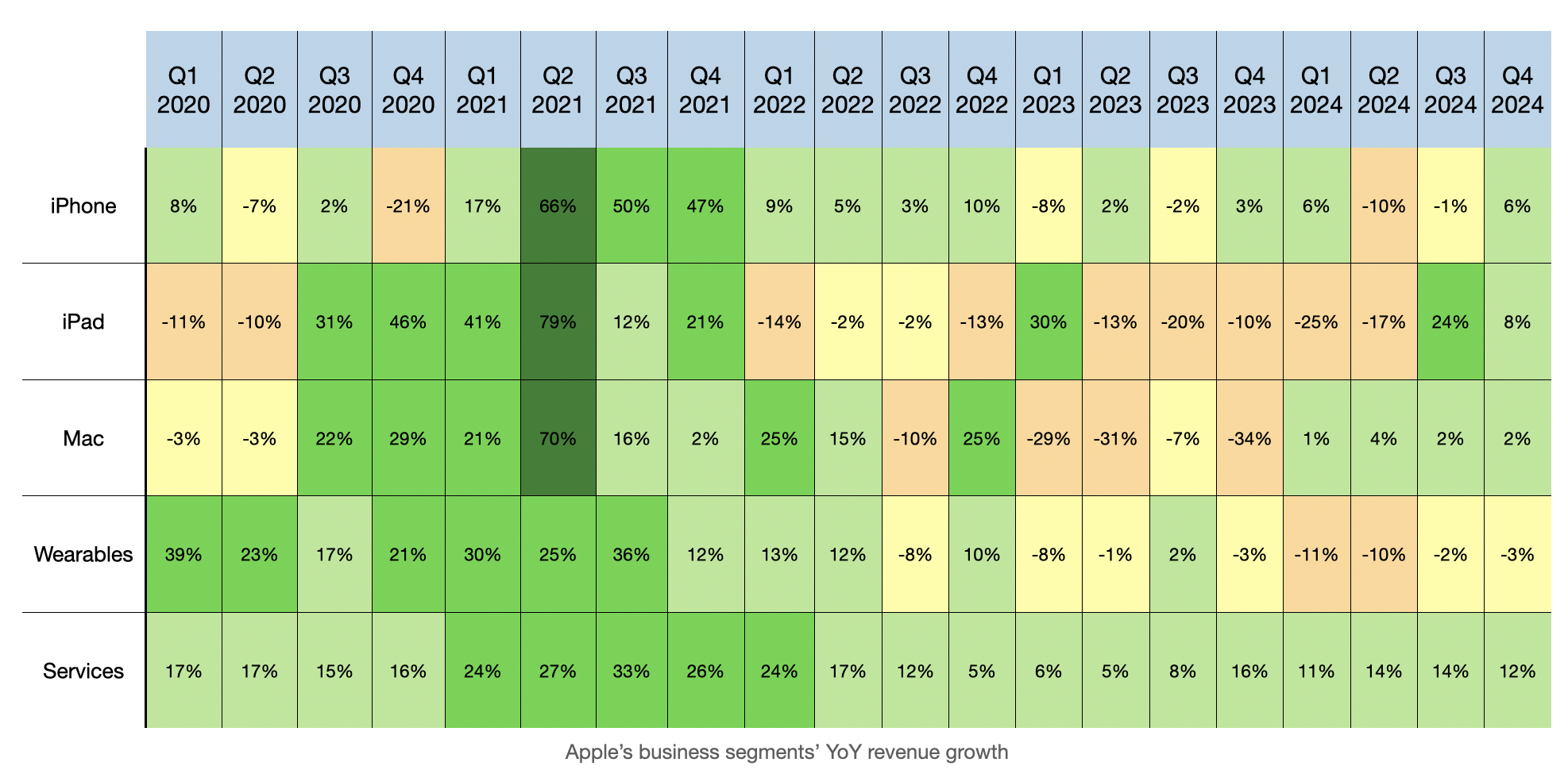 - iPhone revenue is good and the new iOS is reported to have great adoption rate. Will Apple Intelligence spark a supercycle?